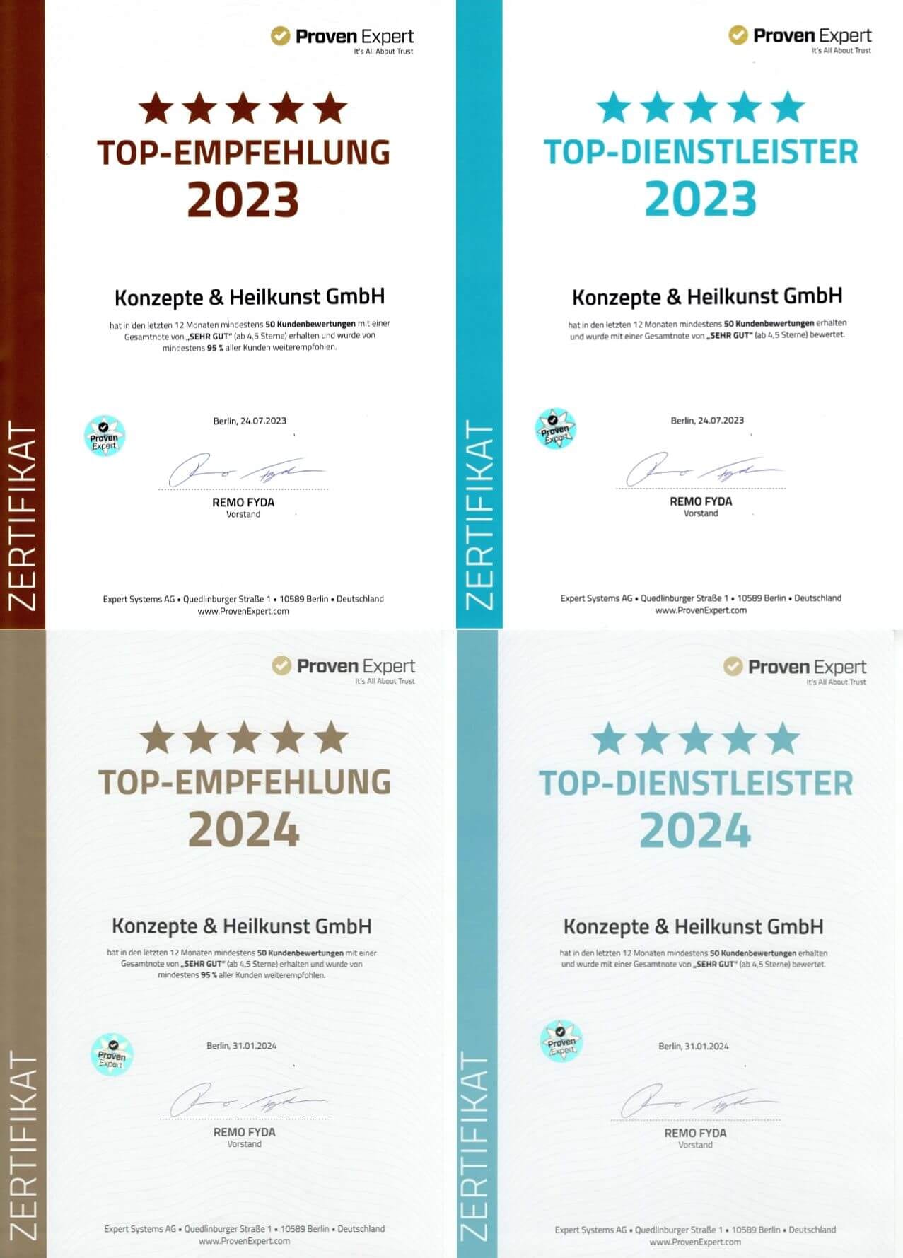 Im Januar 2024 folgten dann die Auszeichnungen „Top-Dienstleister 2024“ und „Top-Empfehlung 2024“. An dieser Stelle möchte sich das Team von Konzepte & Heilkunst ganz herzlich bei den Kundinnen und Kunden für die tollen Rückmeldungen bedanken.
